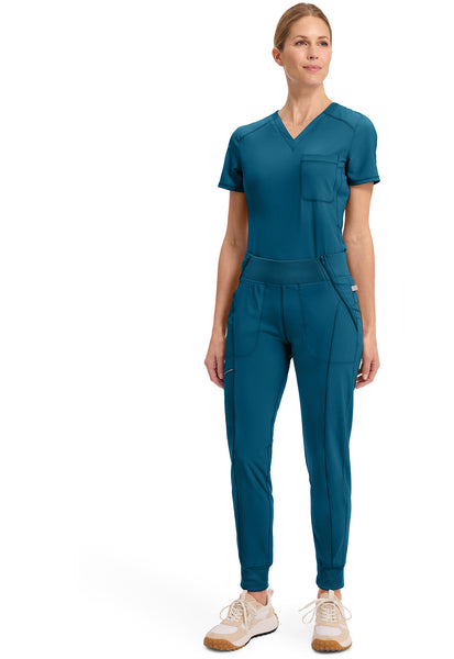 A Contemporary fit, mid rise, jogger features a rib knit elastic waistband with front angled zipper pockets, cargo pocket with reflective tape, two back patch pockets, rib knit leg bands for adjustable length and coverstitch detail throughout. Inseam: 31 1/2". The comfortable stretch poplin fabric and super stretchy rib knit is the perfect combo for healthcare professionals.